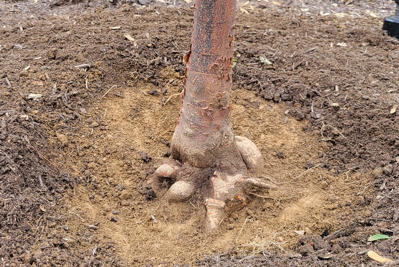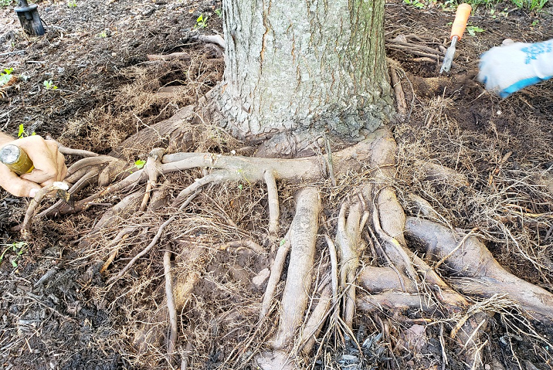 Trees need to be planted in specific ways to ensure proper root growth and health. Trees planted too deep, too shallow, or covered with too much mulch can fail to take proper root. Improper planting can lead to insect and disease infestation and poor movement of resources throughout the tree. The root collar is an important part of a tree because new roots form there. If a tree lacks the necessary space, there will be insufficient room for healthy root growth. To resolve these issues, we often perform root collar excavation, carefully removing debris around the base of the tree to expose the stem portion that is supposed to be above ground.