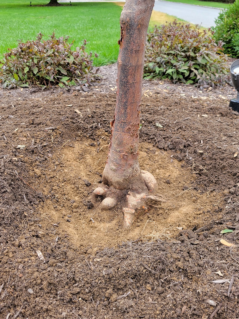 Quite often, landscape plants and trees are planted in ways that inhibit establishment and growth: either too deep in the ground, too shallow with mounded soil, or finished with excessive mulch. These issues may seem minor, but planting technique is the most common cause of landscape plants’ failure to take proper root, establish, and thrive. Planting depth and mulch depth can lead to development of girdling roots (described below), insect and disease infestation of the root collar, and poor movement of resources up and down the plant. Root collar excavation makes use of hand tools or compressed air to carefully remove debris that has accumulated around the base of the plant to expose the stem portion that is supposed to be above ground. Once the root collar is exposed, further treatments may be necessary to restore the proper function of this critical tissue that transitions the plant from roots to stem.
